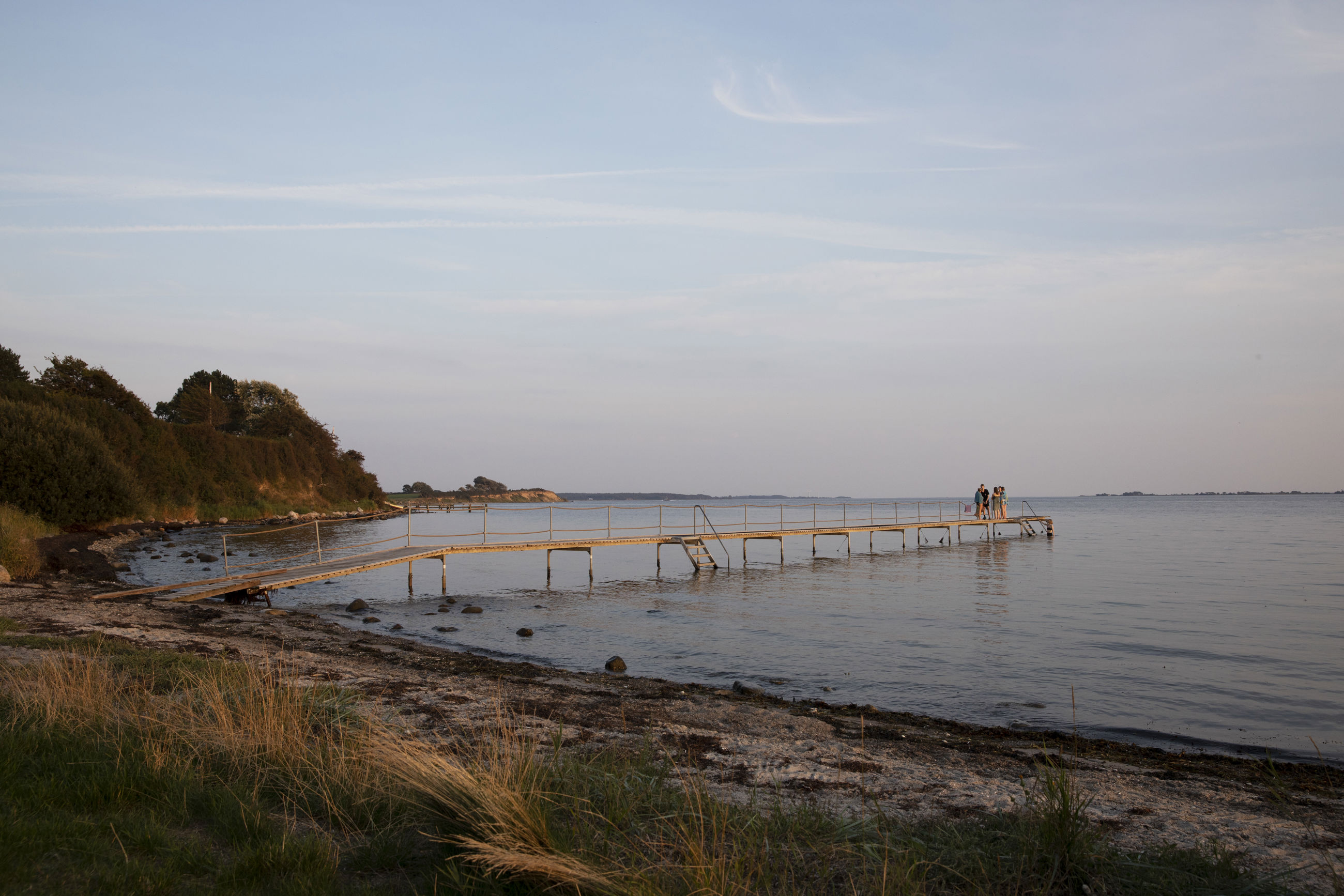 Stranden er børnevenlig med lavt vand og badebro i badesæsonen.